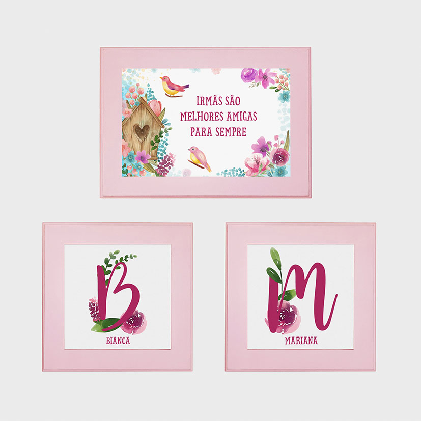 Kit com três lindos quadros infantis para decoração de quartinho para Irmãs, tema Jardim de Passarinhos!