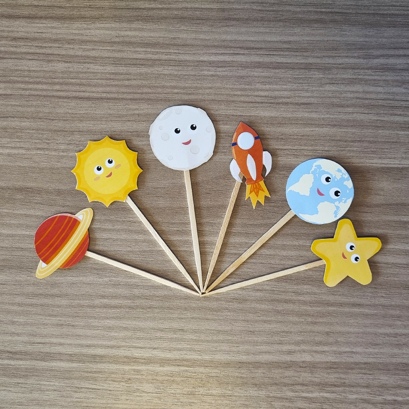 - kit contém 6 unidades com tema foguete e planetas (1 de cada modelo conforme foto)